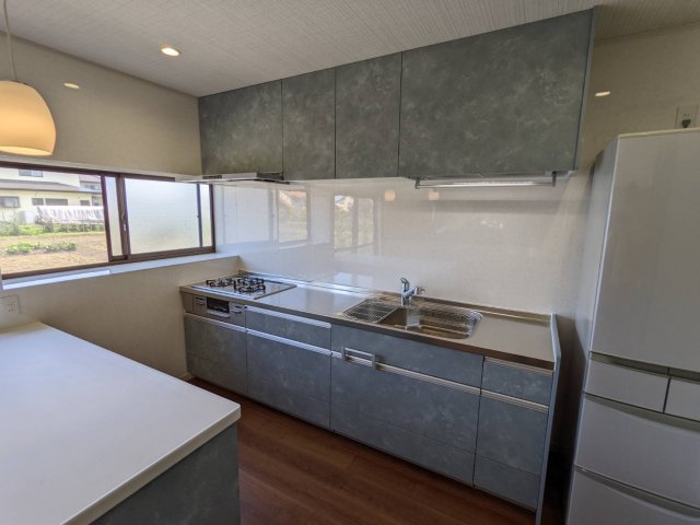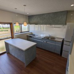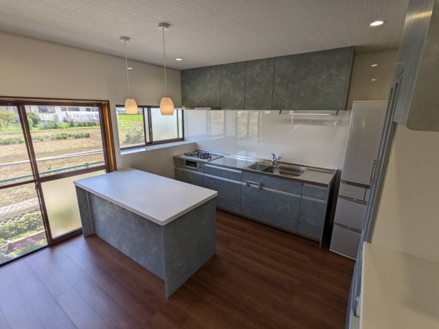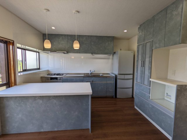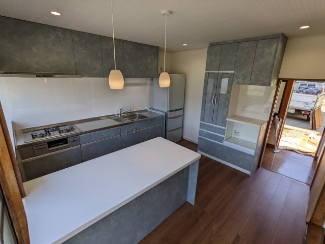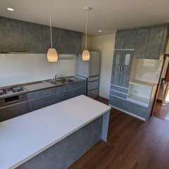 既存のシーリングライト1灯から、全体を照らすダウンライト4灯とキッチンカウンター用のペンダントライト2灯に変更。ダウンライトはシーンによって昼白色、蛍光色が切替えられる商品を、ペンダントは奥様の品の良いセンスで、落ち着いていて可愛らしいものをチョイス♪昼と夜で違った趣のあるキッチンが出来上がりました。