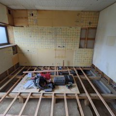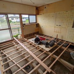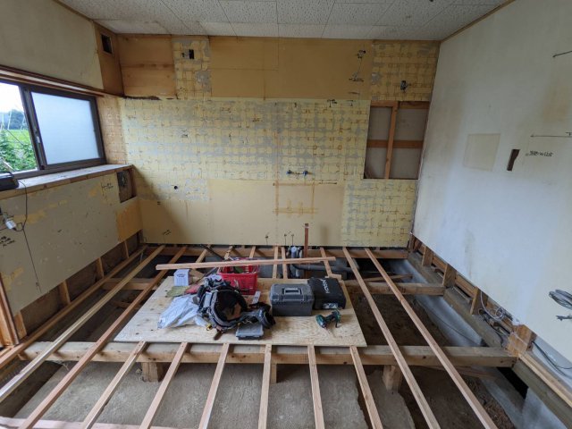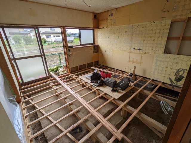 床も根太を入れ替え、合板を捨て貼りをした後に新規フローリングを施工
