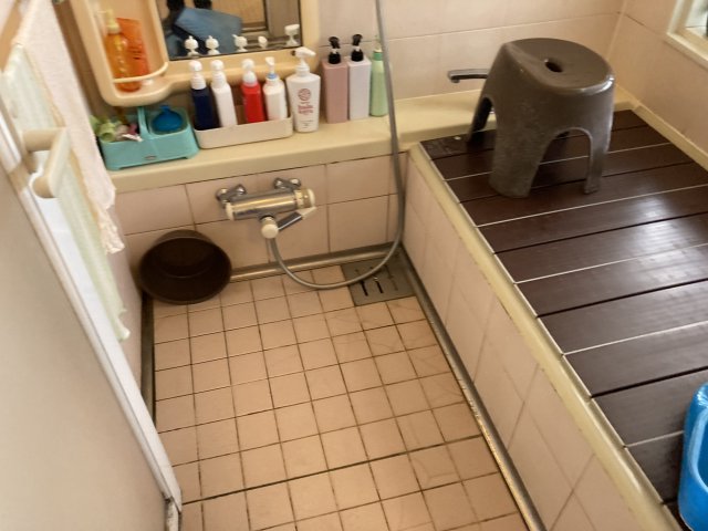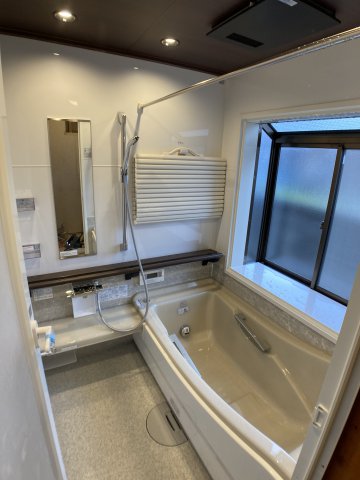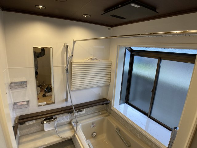 ご夫婦そろって好印象だったのが横パネルとワイドな手すり、傾きの変えられる収納棚が特徴のアクリアバスでした。天井の色も変えられてとても落ち着いたシックなお風呂が出来上がりました!!