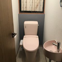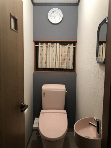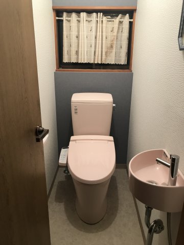 事務所の和式トイレを洋式へリフォームしました! 手洗器も交換して壁紙を1面アクセントにすることで雰囲気もとても変わりました☆ トイレ:アメージュ/リクシル 手洗器:狭小手洗い/リクシル