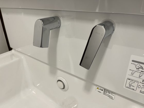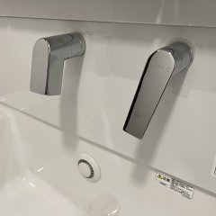 サクアの洗面ボウルは、シャープな印象のスクエア形状。容量たっぷりのひろびろ設計ながら、両サイドには、石けんやコップなども置ける物置スペースを確保しているので、物が多い洗面所では、一時置きとしてとても便利です。