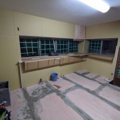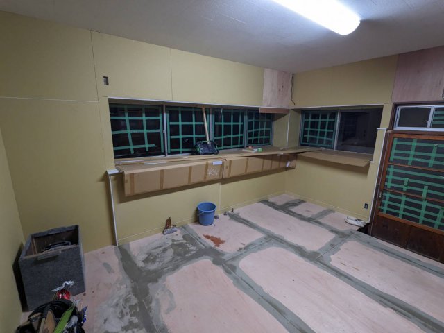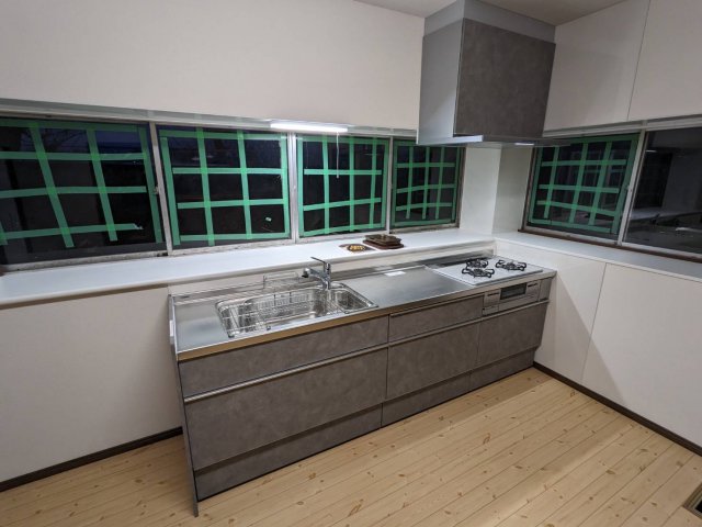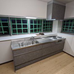キッチンはブロックキッチンからシステムキッチンに…吊戸棚届かないし、いらないとのことで吊戸棚は無し!出窓は腐食部分を補修して、補強して、AICAのカウンターを使用しています。これで贅沢なちょい置き空間を保持できます。予算の関係上キッチンパネルを貼ることもありますが、やはりカウンター材の方が格好いいし、しっかりしているのでこちらの方がオススメです。