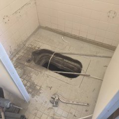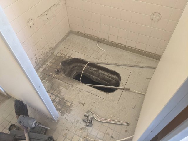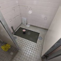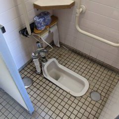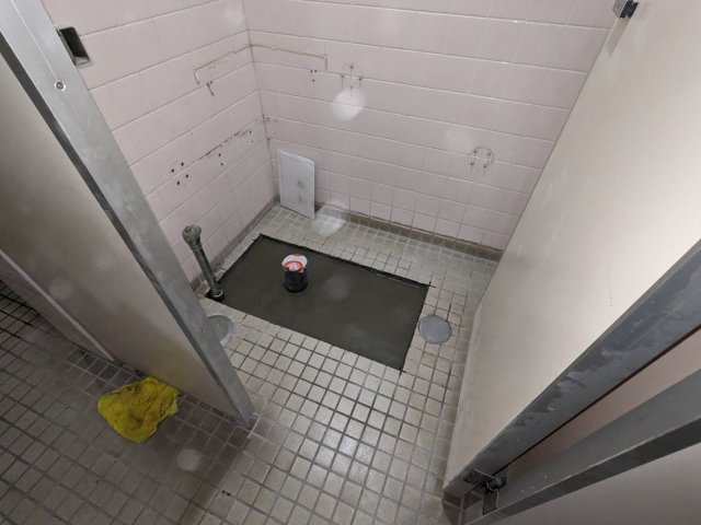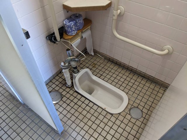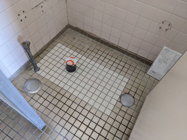 既存の和式トイレのフラッシュバルブ(流すときに押すボタンみたいなやつ)…よく見ると曲がっていますね、「女性も用を足した後に蹴るんだ…だから曲がってしまう。」と現場調査の時に管理人さんに教えてもらいました。勉強になりました。