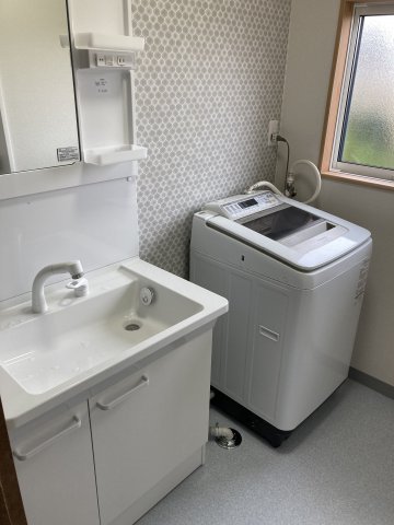 脱衣場は真壁から大壁にしました、洗濯機裏のアクセントクロスが可愛くてお気に入りです。