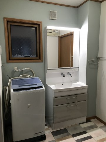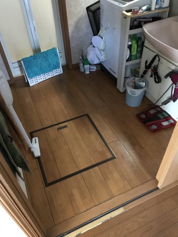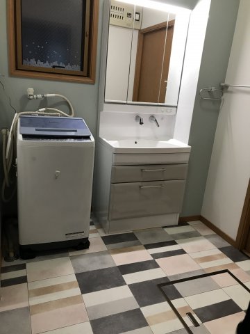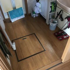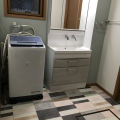 また、脱衣所の内装も変えましたが、アクセントの水色と床の北欧のようなタイル調が合っていてまたまたお洒落な空間になりましたよね!お客様の素晴らしいセンスに感動です。