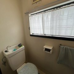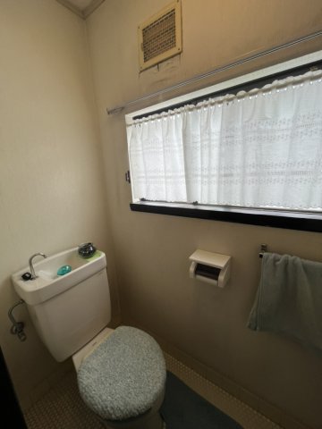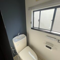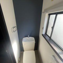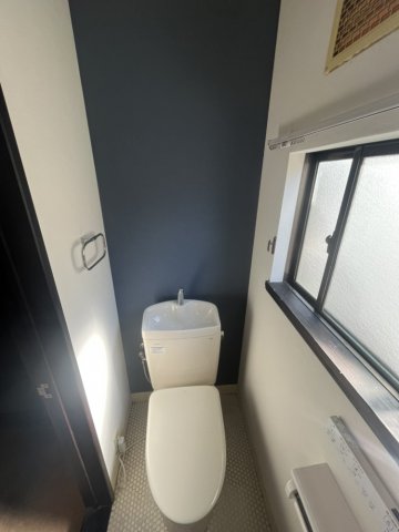 床のタイルは既存利用し、トイレの後ろにアクセントでネイビーの