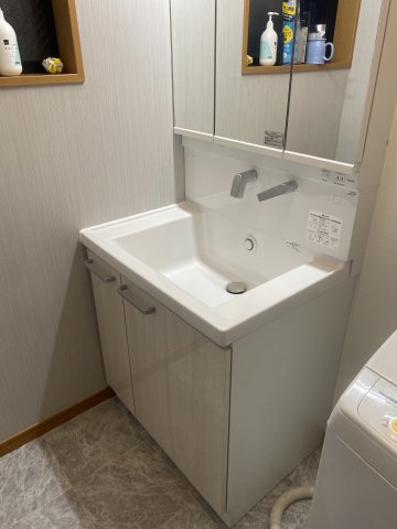 ●脱衣場改修 TOTOサクア 750サイズ 片引き出し 内装パック(天井、壁→クロス貼り 床→クッションフロア)