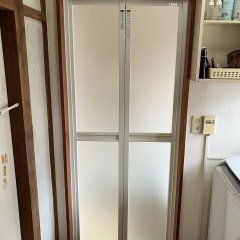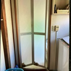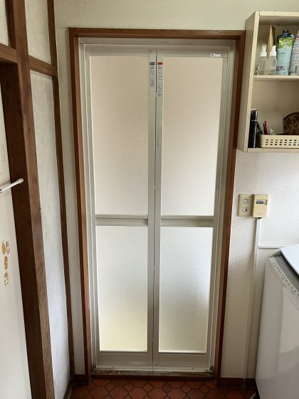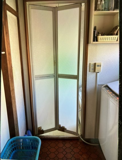 浴室折戸は、下部分が割れてしまっていたため、同じタイプの折戸に交換させていただき、ました。