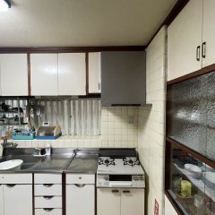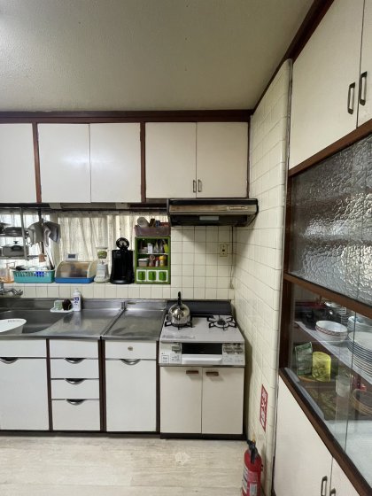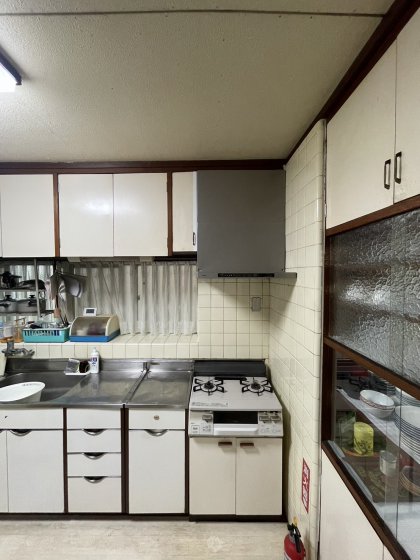 レンジフードの上につり戸棚があったため、つり戸棚を加工させていただき、幅60cmのレンジフードを取付いたしました。