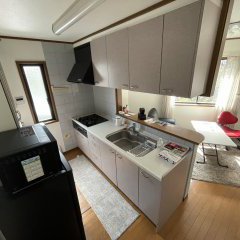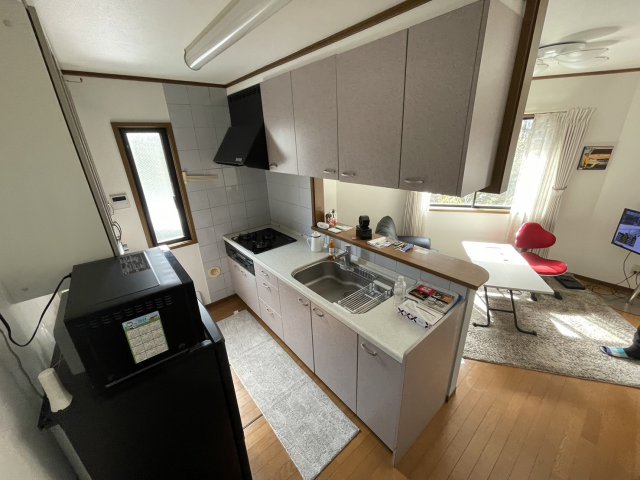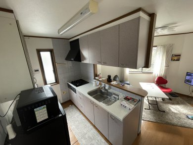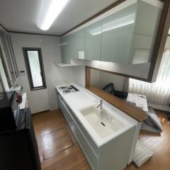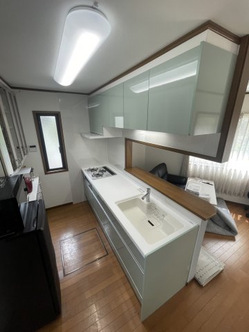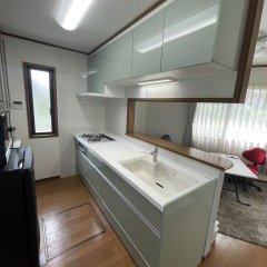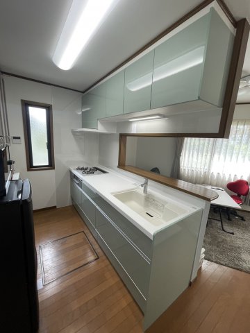 タイル部分にパネルを貼り、つり戸棚の小さくしたことでより広々とした作業スペースとなりました。また、本体の色も明るく爽やかなキッチンになりました。