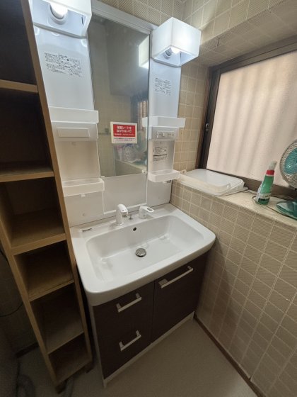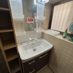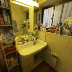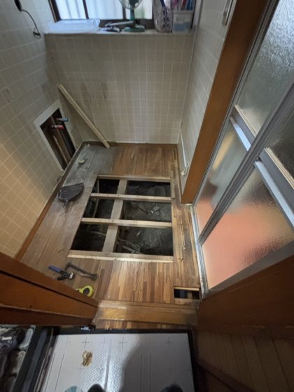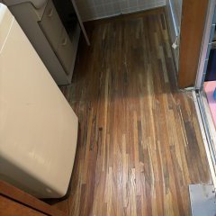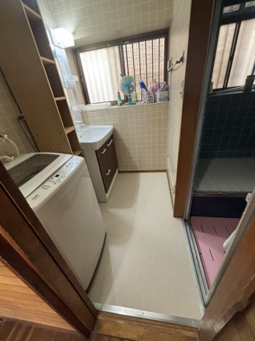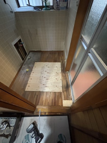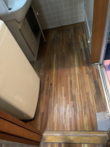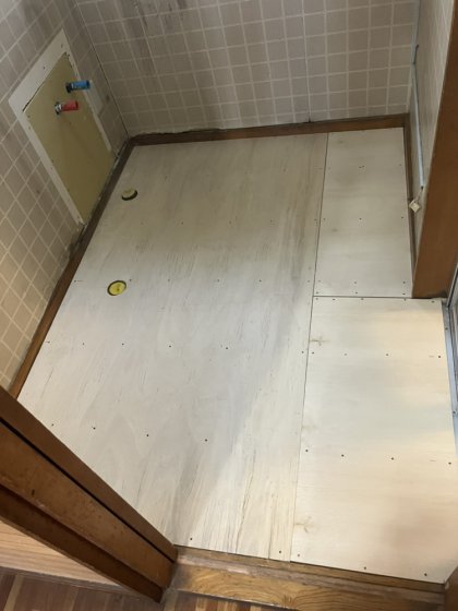洗面室の床にたわみが見られたため、腐食箇所を補強したうえでベニヤ板を重ね張りし、仕上げにクッションフロアを施工しました。