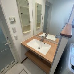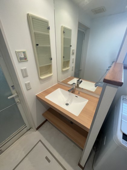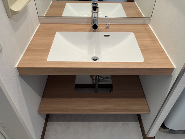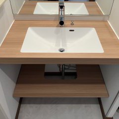 木目調カウンターとシンプルな洗面ボウルで、清潔感と温かみのある空間に仕上がりました。既存のスペースを活かしながら毎日の使いやすさを重視したリフォームになります。