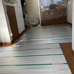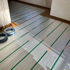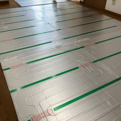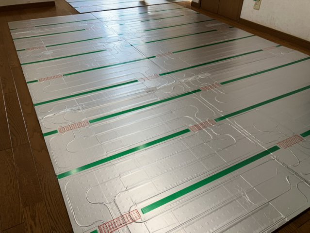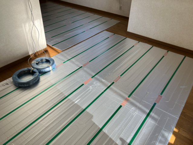 今回、戸建て住宅の リビングとダイニングの続き間にガス温水式の床暖房マットを敷設しました。