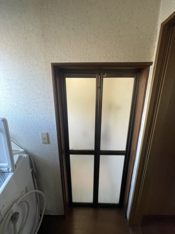 入口まわりですが、脱衣場の内装貼り替えを行わないため、化粧材で周囲を化粧し、