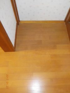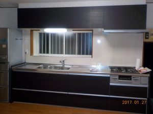 古くなった据え置き型のキッチンを システムキッチンにリフォーム致しました。 床も一部、傷んでいるため、 補修した上で、フローリングを重ね貼りし、 床も新しくなりました。 壁と天井のクロスの貼替、 照明器具も新しくしました。