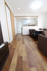 また、壁や天井もビニールクロスを貼りかえて、お部屋と気分を明るく変えるリフォームを行いました。そして見落としがちな床ですが、フローリングの上からフロアタイル(ウッドタイル)を施工させて頂き、とても風合いのあるフローリング調のタイルで仕上げました。
