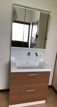 施工前の洗面化粧台は開き戸のため奥の物が取り出しにくく、腰が痛いというご相談をいただきましたので2段引出しタイプをご提案させていただきました。