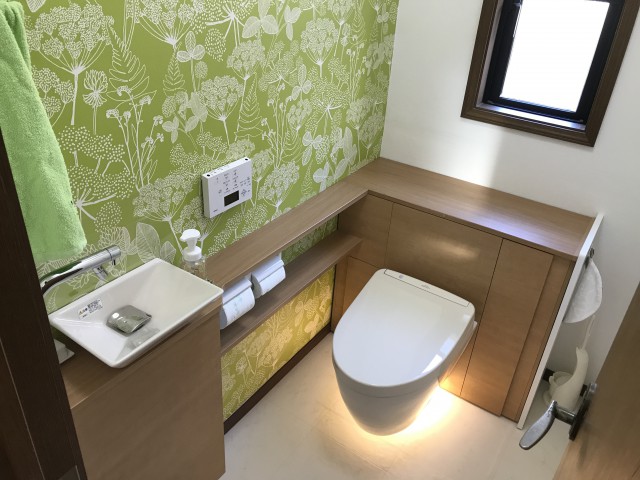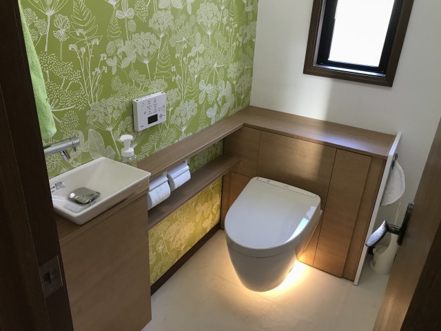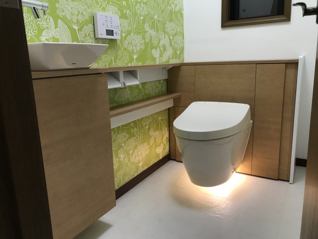 TOTOレストパルは、スタイリッシュで機能性抜群!! 便器が床と離れているので、便器の下もサッと拭き掃除が可能です。 便器の外観は、凹凸が少ないスッキリデザインで拭き掃除がとっても楽 お掃除のストレスがありません。 壁のクロスを替えてイメージチェンジをし、床はクッションフロア仕上げにし とても清潔感のあるお洒落なトイレ空間に仕上がりました。