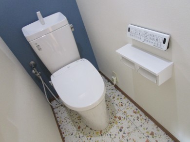 ウォシュレットの故障からトイレリフォームをご検討。 同時に内装も張り替えました。 お客様も使用するトイレなので良いものをつけたい!と、便座は自動開閉・自動洗浄機能のものを採用。 内装はご夫婦で時間をかけて選定し、スタイリッシュで素敵な空間になりました。