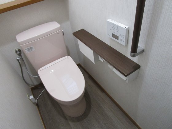 トイレの色はピンクにし、ピンクに合わせて壁紙は控えめなお花柄にして可愛らしい空間になりました。