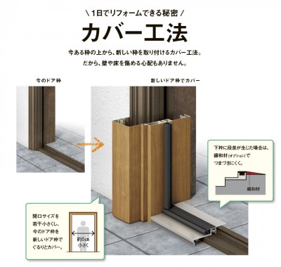 「カバー工法」と呼ばれる、既存の枠にさらに新しい枠をつけてあげるやり方です。