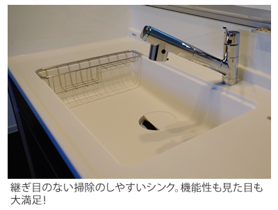 カウンターとシンクを一体成型することで、継ぎ目をなくしました。隙間や溝がなく表面に凹凸がないので汚れがたまりにくく、掃除はさっと拭くだけ。