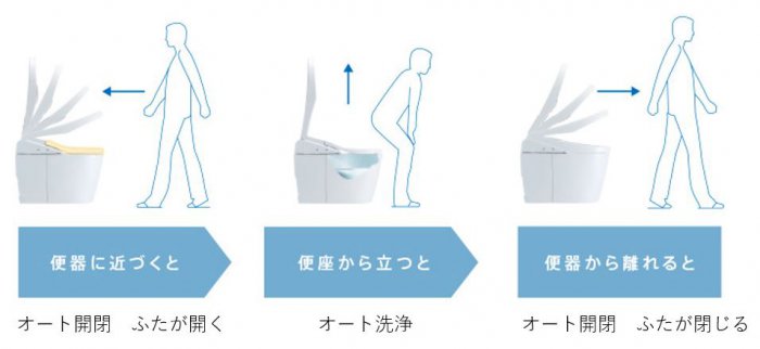 最新のトイレには人感センサーによるオート機能があり、トイレに入ると自動で便ふたが開きます。便器から離れれば自動で洗浄水が流れ、便ふたが閉まります。これなら、水の流し忘れもふたの閉め忘れもありません。