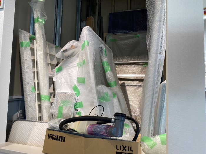 只今、所沢店では、展示ブースの一角に組み立て前のユニットバス一式が鎮座しているというなかなレアな光景が広がっております。