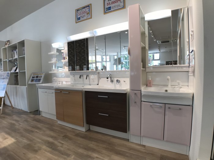 洗面台も複数メーカー、様々なタイプのものを展示。