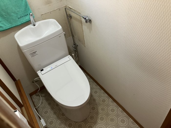 給水ホースが届かないため、取替用止水栓(TS220FU2)を用いて新しいトイレを設置いたしました。