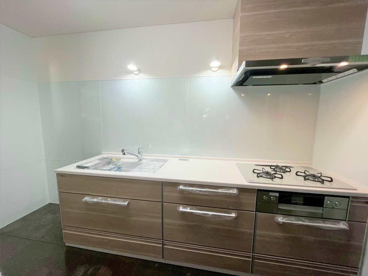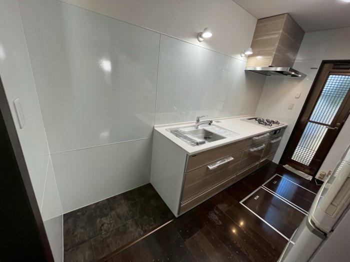 間口は2550へ変更。キッチンの下にはフローリングが貼られていなかったので、クッションフロアを部分的に施工して完了しました。