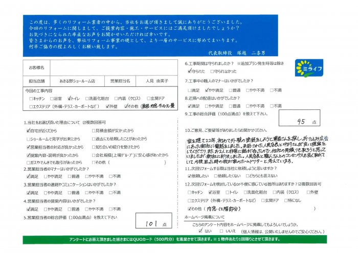 家を建て22年初めて外壁の塗装をしようと業者さんを探し折り込み広告にあった御社に電話をしました。来訪された人見店長と中村さんが良い提案をしてくださり、またお2人と非常に話が合ったので、他社の見積りも取ろうと思っていましたが、御社に即決しました。