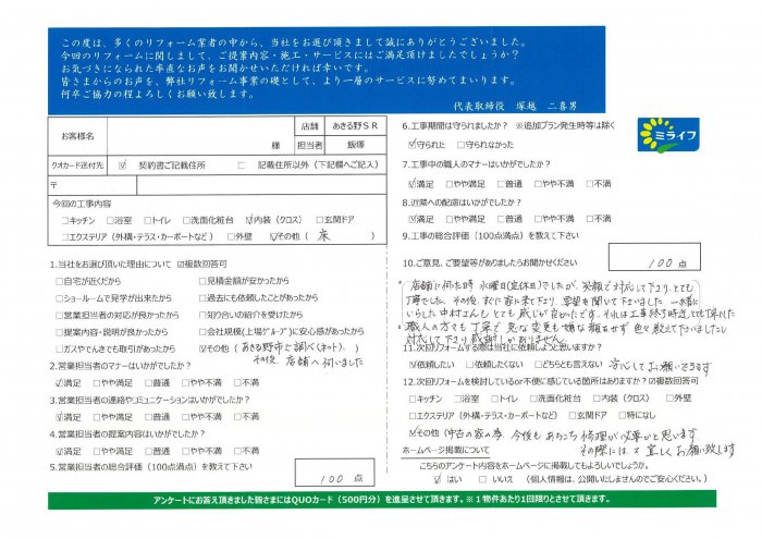 店舗に伺った時水曜日(定休日)でしたが、笑顔で対応して下さりとても丁寧でした。 その後、すぐに家に来て下さり要望を聞いて下さいました。 一緒にいらした中村さんもとても感じが良かったです。 それは工事終了時迄とても丁寧でした。 職人の方々も丁寧で急な変更も嫌な顔をせず、色々教えて下さいましたし対応して下さり、感謝しかありません。