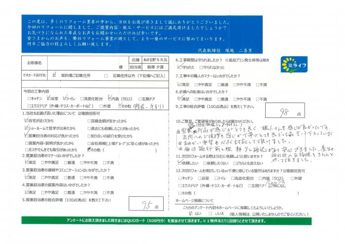 営業の方(担当飯塚さんと中村さん)の対応が感じがとても良く、職人さんも感じが良かったです。