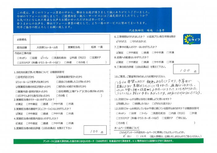 こちらの要望に対して、親身に対応して下さり予算内で見違えるほど素敵なトイレにして頂きました。