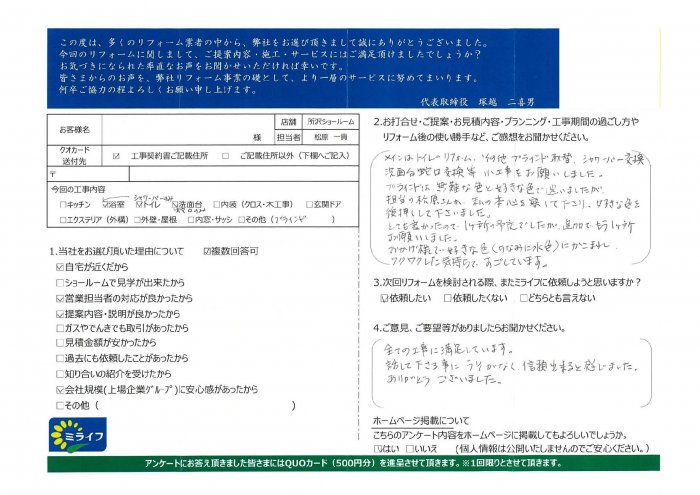 全ての工事に満足しています。話して下さる事にうそがなく、信頼出来ると感じました。
