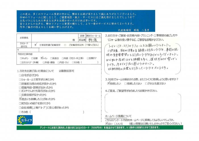 トイレ(1F、2F)のリフォームをお願いいたしました。