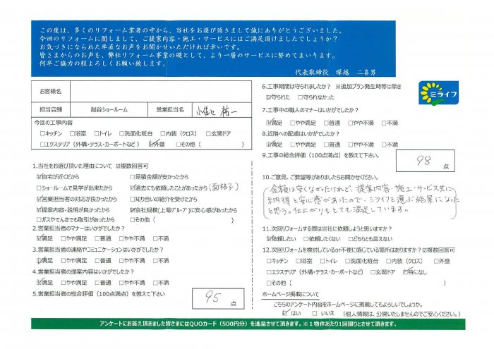 金額は安くなかったけれど、提案内容・施工・サービス共に納得と安心感があったので、ミライフを選ぶ結果になったと思う。 仕上がりもとても満足しています。