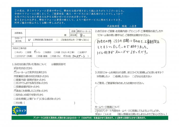 打合せの時こちらの日程に合わせて工事期間をしてもらいましたので助かりました。