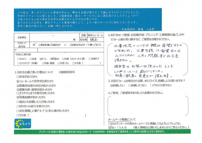 工事内容については、概ね希望どおりにできました。