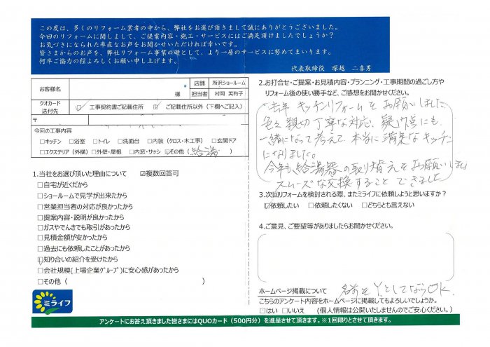 今年も給湯器の取り替えをお願いしました。スムーズな交換することできました。