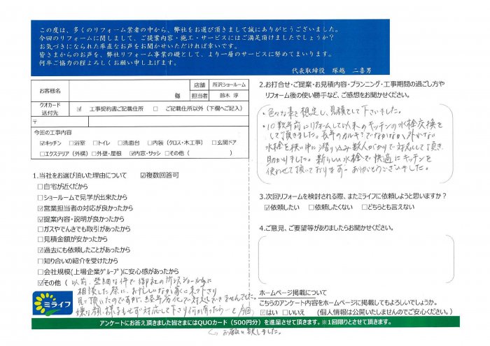 選んだ理由:以前些細な件で御社の所沢ショールームに相談した際に、お忙しいなか家に来て下さり見て頂いたのですが、経年劣化で対処できませんでした。