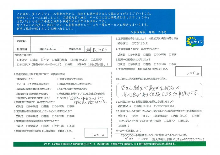 皆さん親切で爽やかな対応に安心感があり、信頼できる仕事振りです。