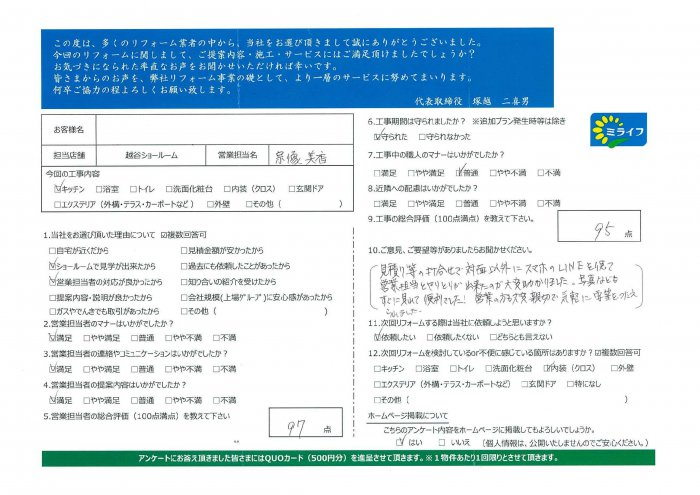 見積り等の打合せで対面以外にスマホのLINEを使って営業担当とやりとりが出来たのが大変助かりました。