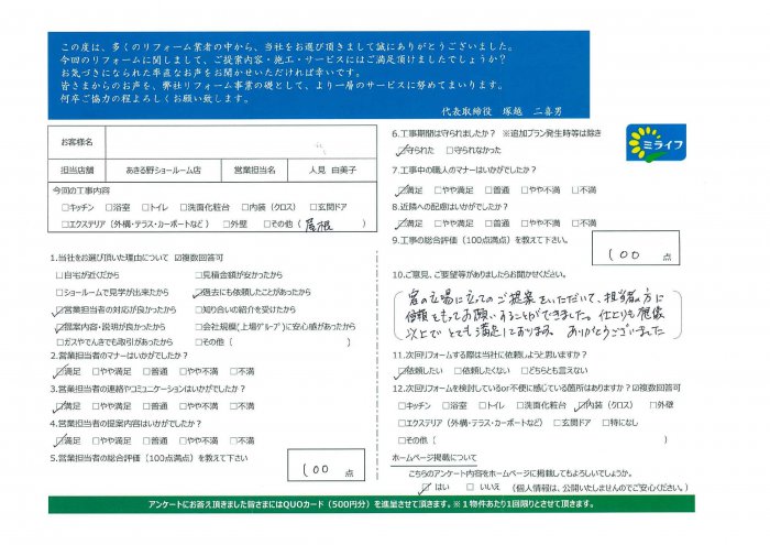 客の立場に立ってのご提案をいただいて、担当者の方に信頼をもってお願いすることができました。 仕上りも想像以上でとても満足しております。 ありがとうございました。