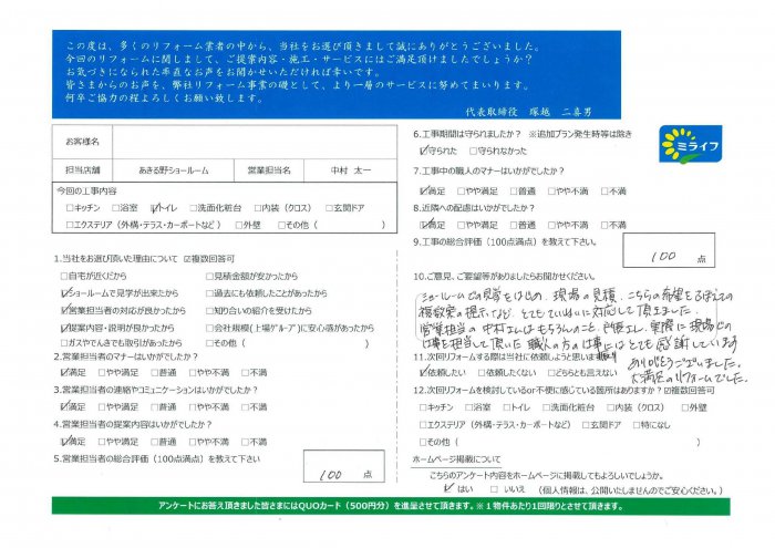 営業担当の中村さんはもちろんのこと、所長さん、実際に現場での工事を担当して頂いた職人の方の仕事ぶりにはとても感謝しています。